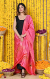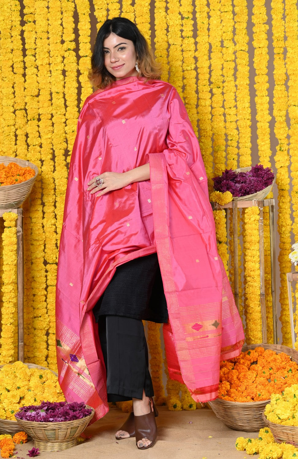 High Quality Pure Silk Paithani Dupatta Collections are a break to your regular lineage of dupattas. The royal embodiment of beautiful Handwoven Paithani Buttis, Zari Border And Paithani Handweave on the ends , adds a surreal edition of fresh handloom weave. ~ Beautiful Tassels~ Authentic Paithani Handweave~ Premium High Quality Pure Silk Fabric~ Exclusive Design curated for style and comfort.~ Pair This Dupatta with Beautiful Earings, as you groove on the latest trend!
