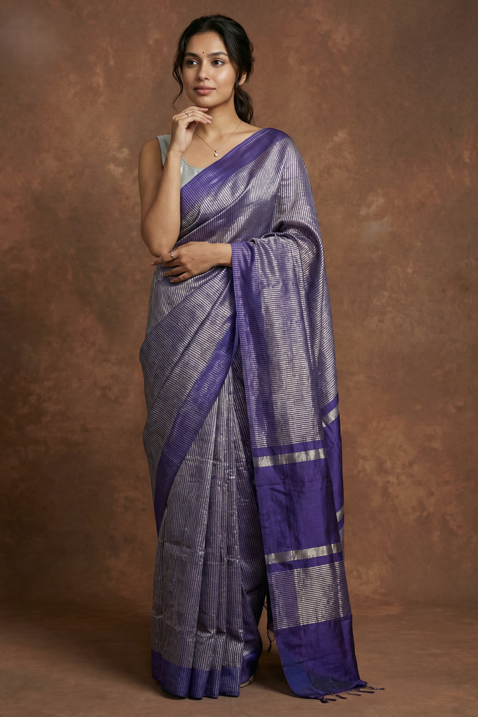 The rich purple hue is enhanced with subtle tissue texture and refined silver zari striping, creating a sophisticated interplay of shimmer and depth. The elegant border detailing adds structure and richness, making it a perfect choice for celebrations, weddings, and special occasions.