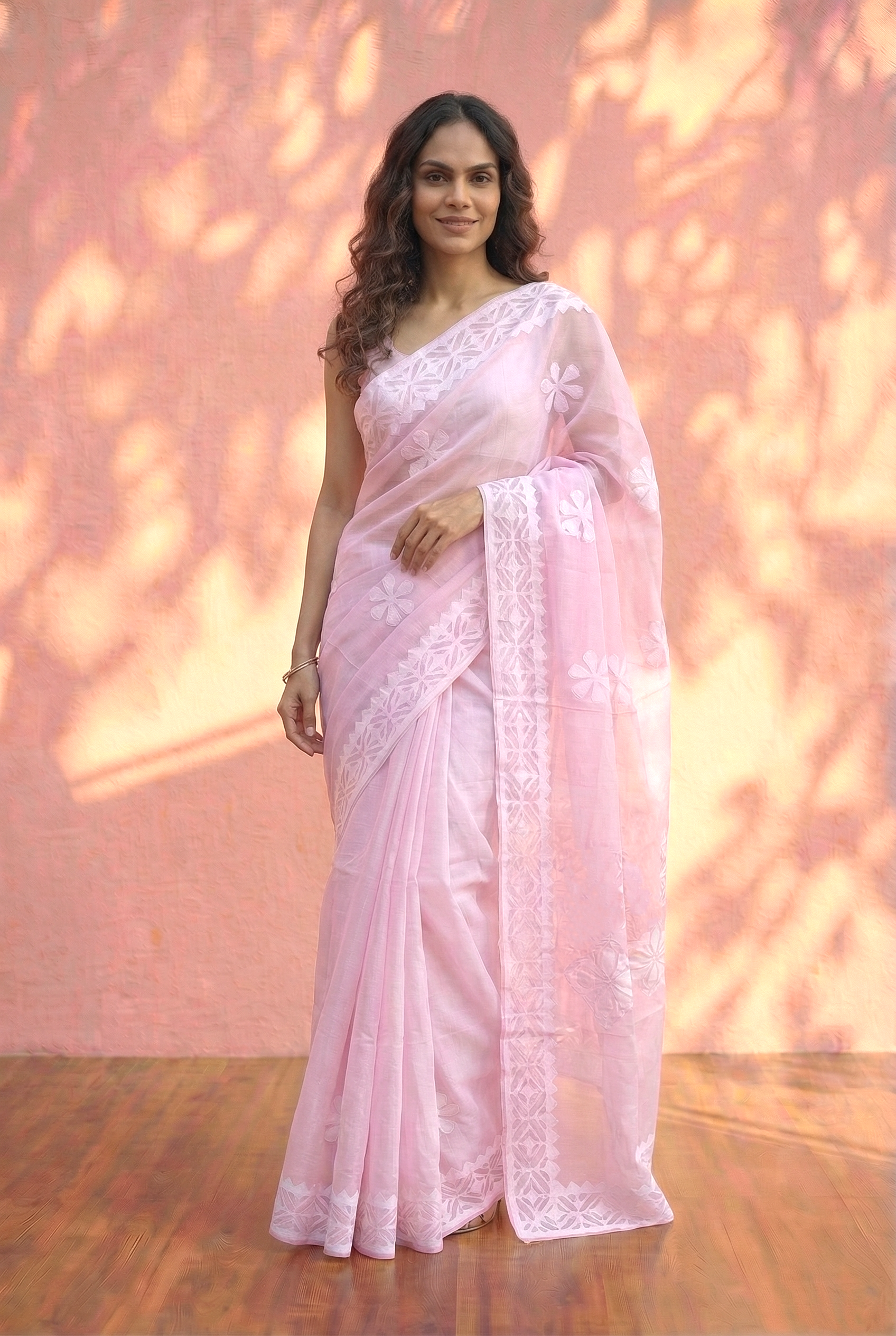 This saree is crafted from lightweight, breathable cotton, making it ideal for all-day comfort while maintaining a graceful drape. The design features delicate hand-stitched floral appliqué motifs placed thoughtfully across the saree, adding texture and artisanal charm without overwhelming the fabric. The Blush Pink enhances its calm, elegant appeal, while the appliqué detailed pallu and border create a refined finish. Perfect for office wear, casual gatherings, and everyday styling, this saree balances craftsmanship with effortless simplicity.