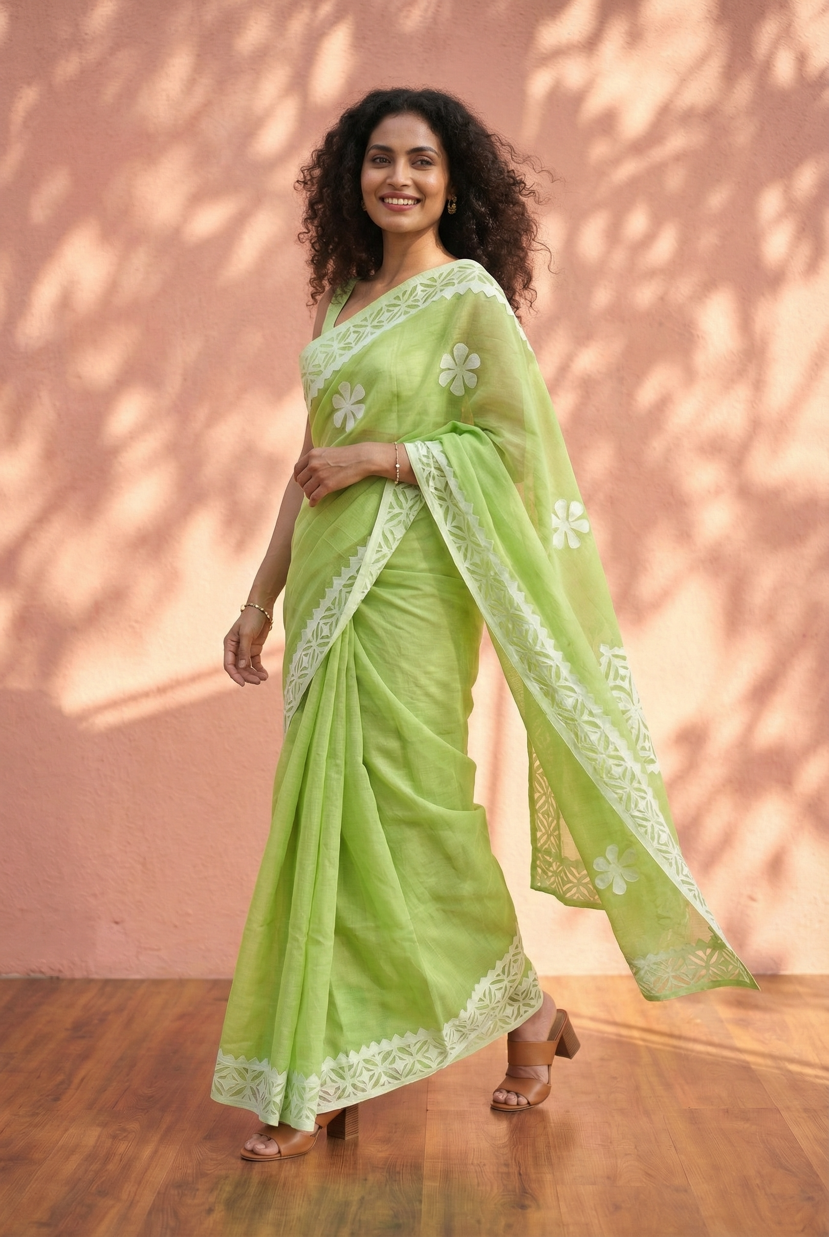 This saree is crafted from lightweight, breathable cotton, making it ideal for all-day comfort while maintaining a graceful drape. The design features delicate hand-stitched floral appliqué motifs placed thoughtfully across the saree, adding texture and artisanal charm without overwhelming the fabric. The Fresh Green enhances its calm, elegant appeal, while the appliqué detailed pallu and border create a refined finish. Perfect for office wear, casual gatherings, and everyday styling, this saree balances craftsmanship with effortless simplicity.