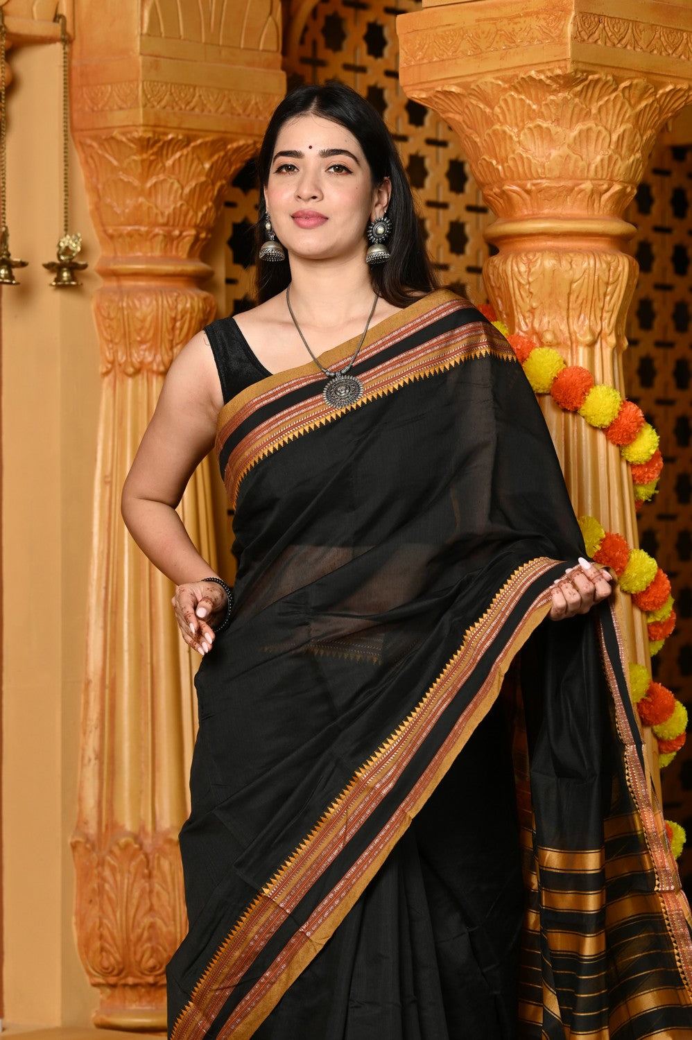 Grace meets tradition in this stunning Cotton Blend saree in a rich, designed to be your perfect companion for both everyday elegance and special occasions. The soft, breathable fabric ensures comfort, while its timeless appeal makes it effortlessly graceful.What sets this saree apart is its intricately woven zari border that beautifully extends into the pallu, creating a seamless flow of shimmering gold against the deep green fabric. The delicate yet striking craftsmanship adds just the right touch of sophistication, making it perfect for festive gatherings, casual outings, and even workwear with a refined edge.Versatile, effortlessly stylish, and undeniably gorgeous—this saree is a must-have for anyone who loves tradition with a modern twist!SpecificationsSaree Color: BlackFabric: Pure CottonWash Care: Dry CleanWeave type: Cotton BlendPattern: SolidBrand: Very Much IndianOccasion: Party Wear/Traditional DrapeProduct category: CottonLength: 6.25 Metres (including blouse)NotesThe blouse worn by the model in the image is from our wardrobe. You can find the running blouse around the length of the saree or you can simply get that ideal look by draping up the saree with a contrast blouse.Since the sarees are hand-dyed, please expect a slight variation from the product displayed in the picture. These minor irregularities are a characteristic feature of genuine handmade products.
