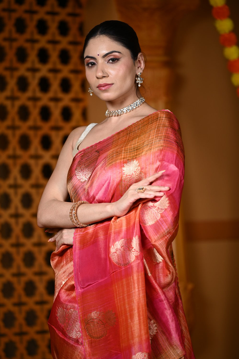 Durva Premium~ Viscose Hand-dyed Rangkaath Saree in Shades of Pink and Orange