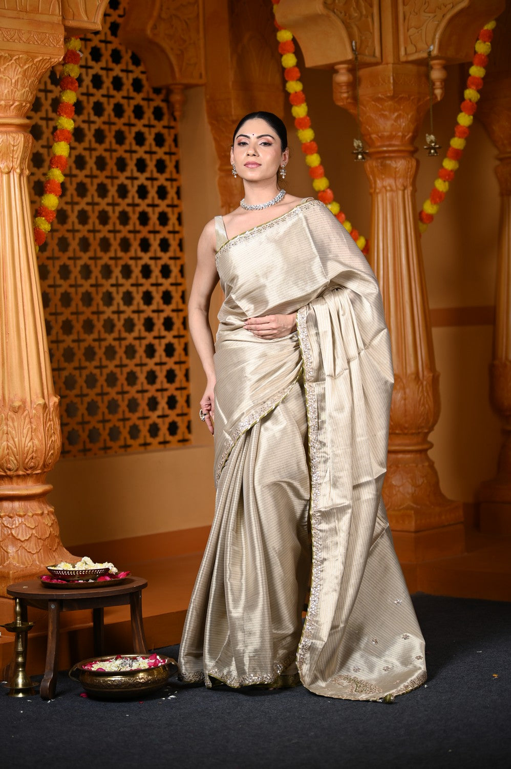 Shimmering like moonlight on still water, this saree is woven in delicate viscose tissue that carries a subtle sheen and fluid grace. Light in weight yet rich in aura, it sets the stage for the intricate magic of Gota Patti embroidery — a traditional craft that originated in Rajasthan, where tiny pieces of gold and silver ribbon are hand-appliquéd onto fabric to create motifs that glow with regal charm.