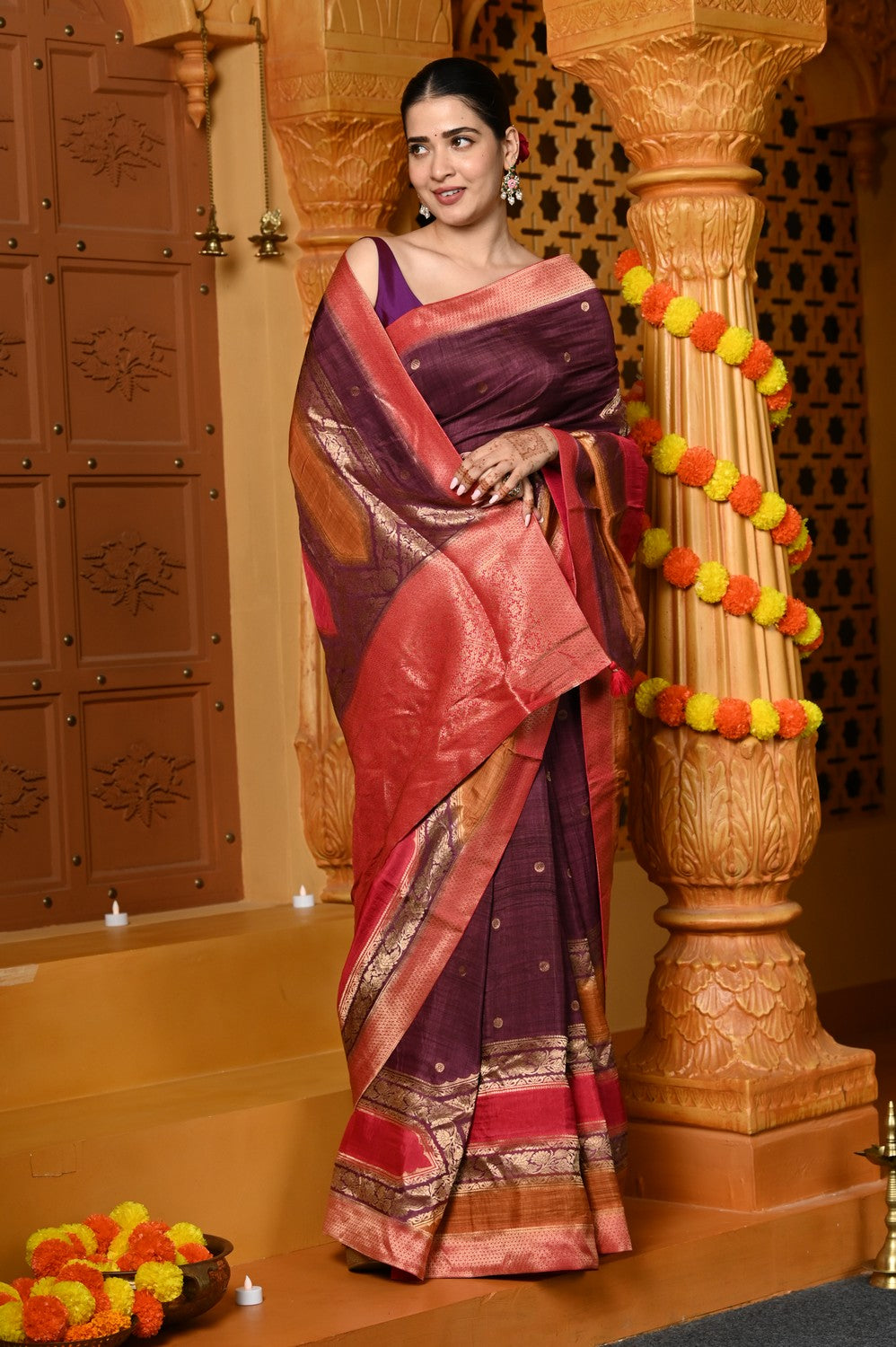 This saree is a story told in colors — where the art of hand-dyeing transforms fabric into poetry. The shade of Mauve Purple rests somewhere between dusk and depth, a hue that shifts with light, giving the saree a soul of its own. Each fold whispers uniqueness, for no two hand-dyed sarees can ever be the same.