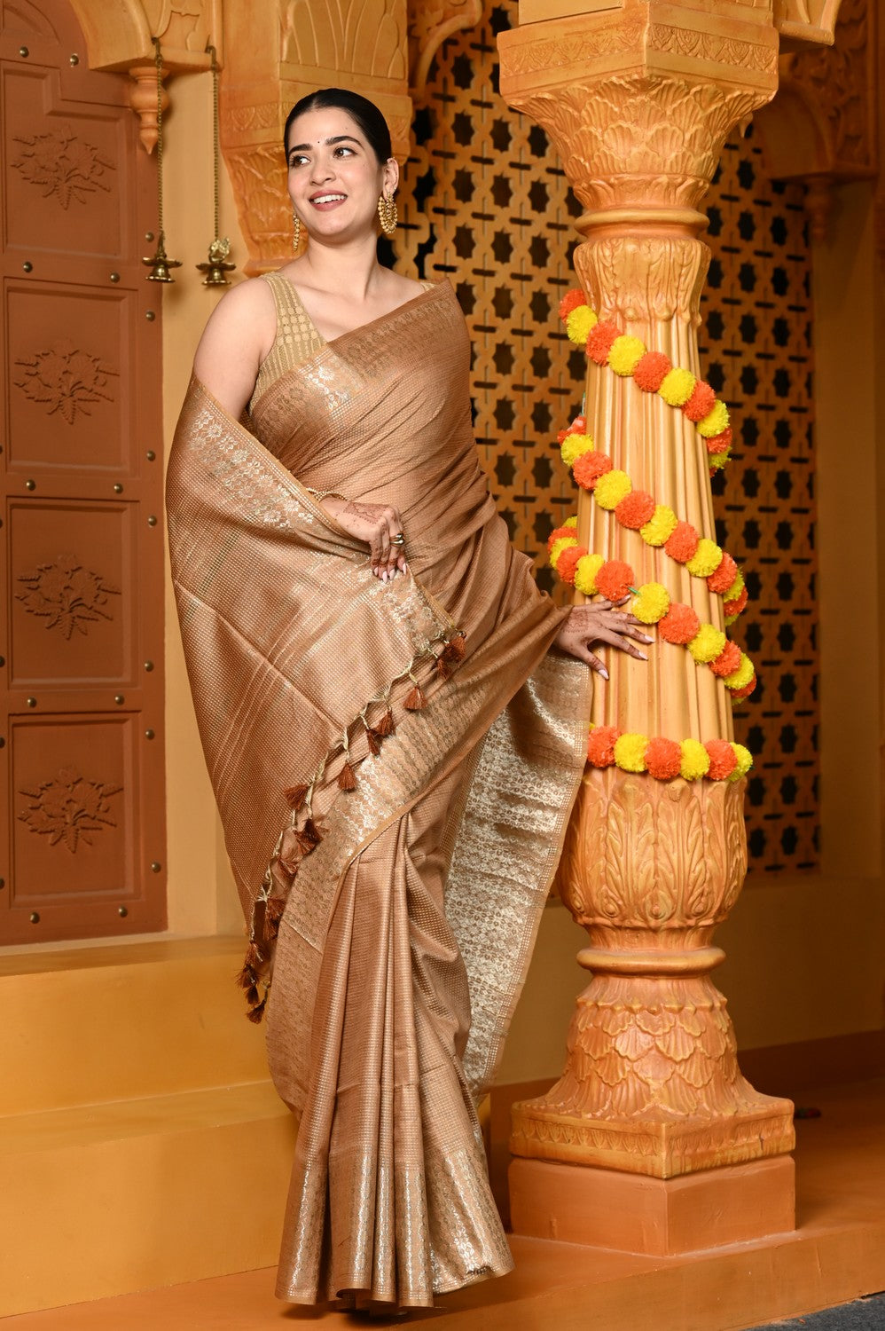 The blouse worn by the model in the image is from our wardrobe. You can find the running blouse around the length of the saree or you can simply get that ideal look by draping up the saree with a contrast blouse.