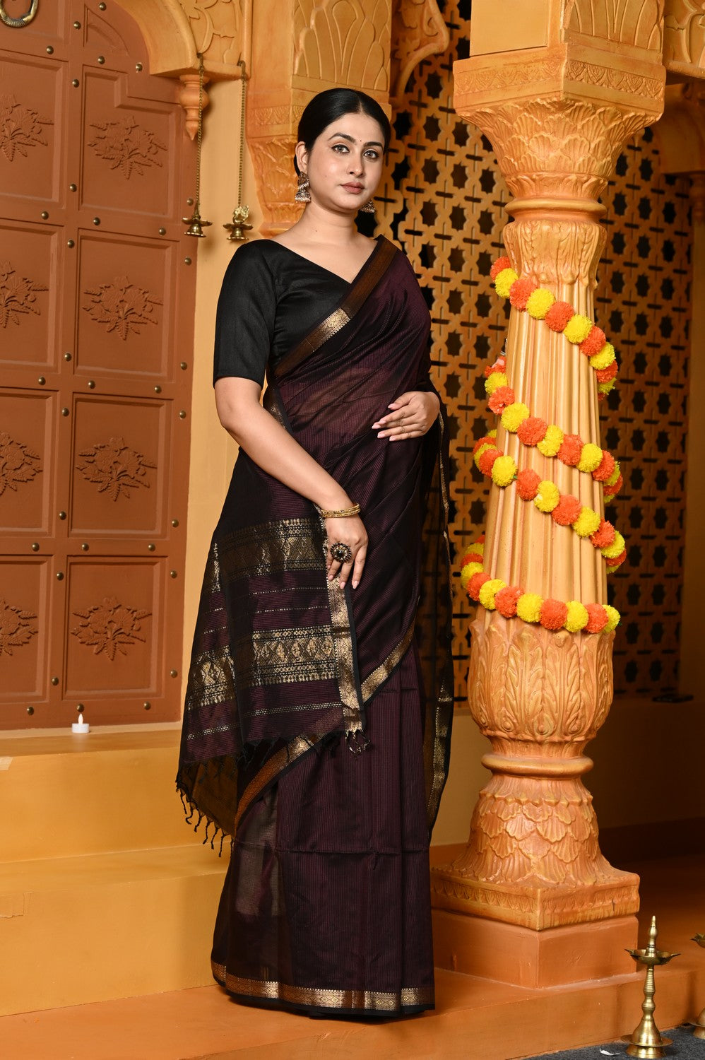 Earthy, elegant, and rooted in tradition — this saree in Dark Blue celebrates the understated beauty of handloom weaving. The golden border adds a festive richness, making it a perfect drape for weddings, pujas, and traditional celebrations. Its deep, warm tone reflects sophistication while carrying the comfort of cotton silk for all-day grace.