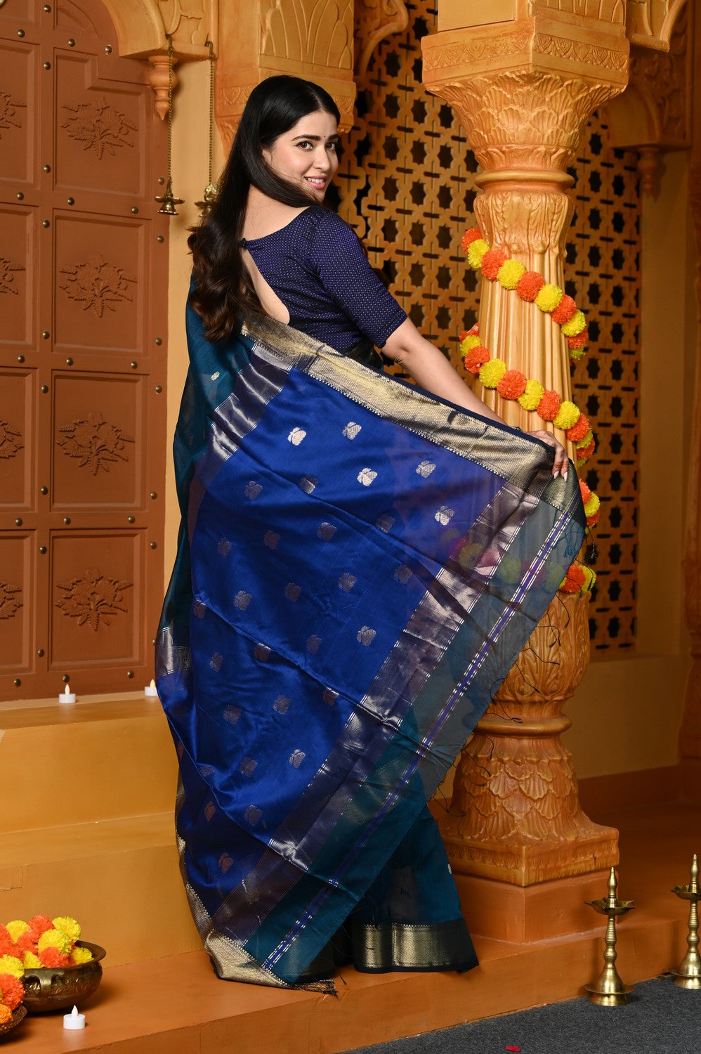 Soft, radiant, and timeless — this saree in exclusive Indigo Blue brings together the elegance of handloom weaving and the richness of tradition. The delicate hue makes it a perfect choice for festive seasons, weddings, or family occasions, while the golden border adds a regal touch to its gentle charm.