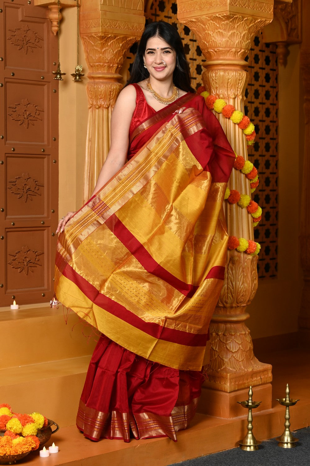 A saree that carries the charm of handloom weaving with a touch of modern elegance, this Red Cotton Silk drape is crafted to perfection for the woman who loves tradition yet seeks exclusivity. The rich hue of Red reflects grace and depth, making it an instant standout for festive occasions and cultural gatherings.