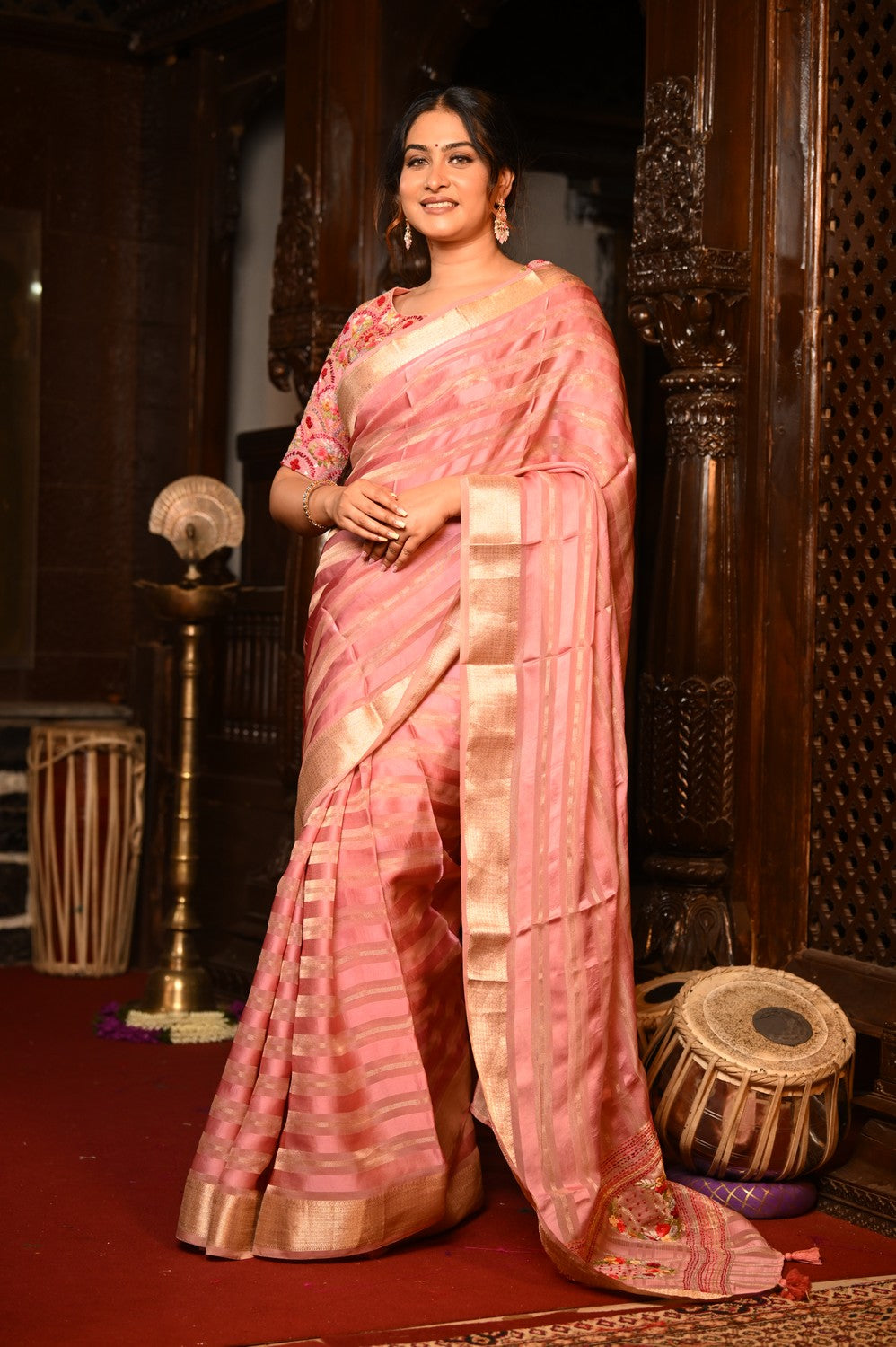 Mahalakshmi Premium ~ Viscose Tissue Saree with Hand-Embroidered Kantha Work in Peach Pink