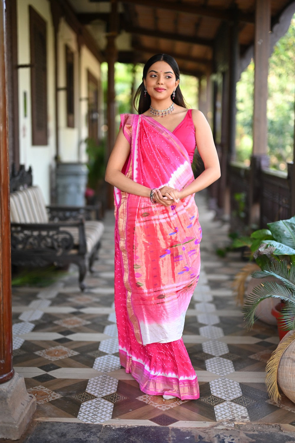 From the coveted Rang Mahal Exclusive collection, this Handloom Pure Silk Bandhani Paithani in soft, radiant pink is a saree that captures hearts the moment it’s seen. The color feels fresh, graceful, and endlessly feminine — the kind of pink customers instantly fall in love with for its warmth and charm.