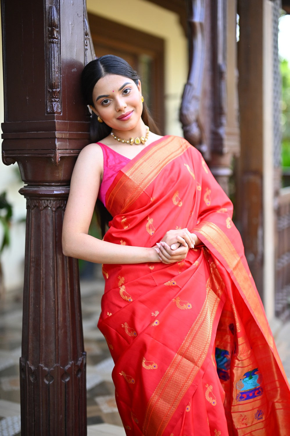 From the grand world of Rang Mahal, this Handloom Maharani Paithani in royal red is a saree that commands the heart before it commands the eyes. The color itself is powerful — rich, auspicious, and unmistakably majestic — the kind of red that has always defined celebrations, weddings, and unforgettable moments.