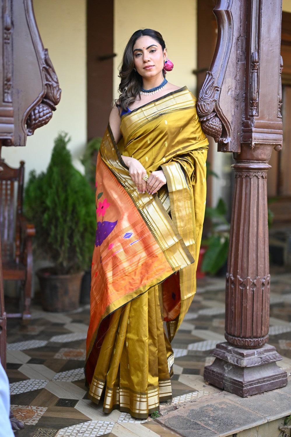 From the luxurious Rang Mahal collection, this Handloom Pure Silk Paithani in graceful mehendi green is a saree that captures the eye and the heart in the same moment. The color is rich, earthy, and deeply traditional — the kind of shade that looks stunning on every skin tone and feels perfect for festive occasions and family celebrations.