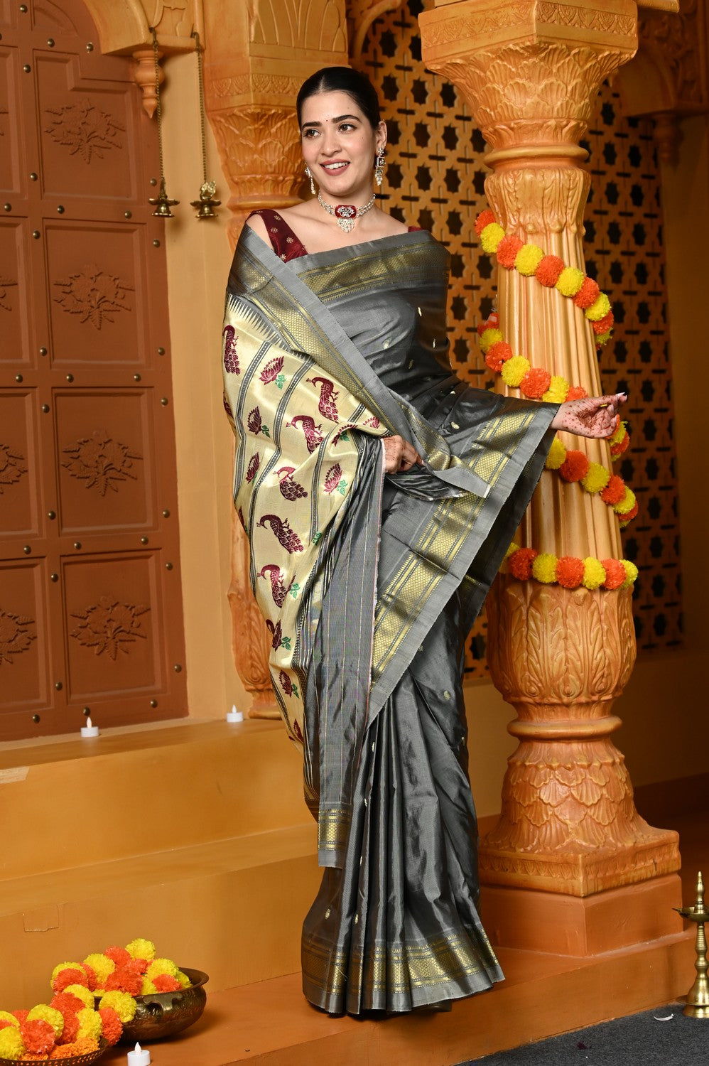 Gaurangi ~ Handloom Pure Silk Paithani Saree with Traditional Peacock Lotus Pallu in Grey