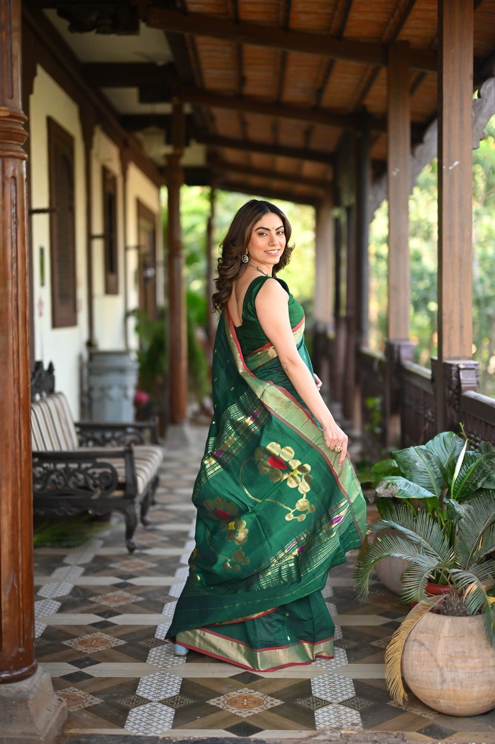 From the heart of the Rang Mahal collection comes a saree that carries elegance in every thread. This Handloom Pure Cotton Paithani in rich dark green is a drape that speaks of heritage, depth, and timeless beauty. The moment you see it, the deep green shade feels grounding and graceful — a color that instantly connects with tradition and looks stunning on every skin tone.