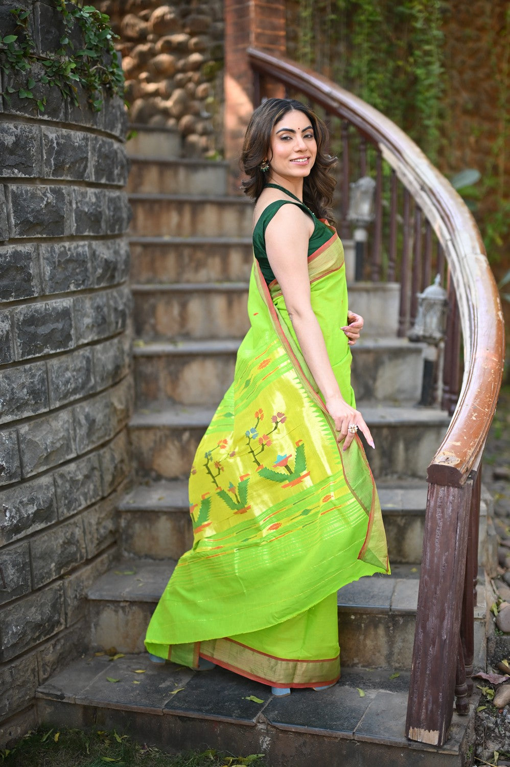 From the cherished Rang Mahal collection comes a saree that feels like fresh morning light — this Handloom Pure Cotton Paithani in bright lime green is a drape that instantly lifts the heart. The color is refreshing, youthful, and full of life — the kind of shade customers fall in love with the moment they see it.