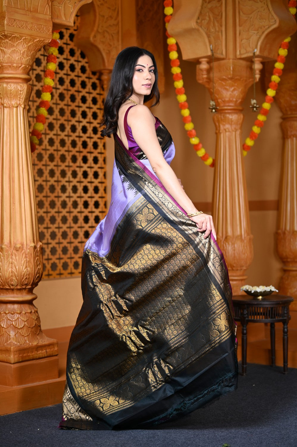 From our Festive Special Collection, this masterpiece embodies the time-honored tradition of Gadwal weaving, celebrated for its distinctive interplay of contrast borders, rich zari work, and fine silk textures. Every thread is carefully handwoven, bringing together body, border, and pallu in a technique that has been perfected through generations.