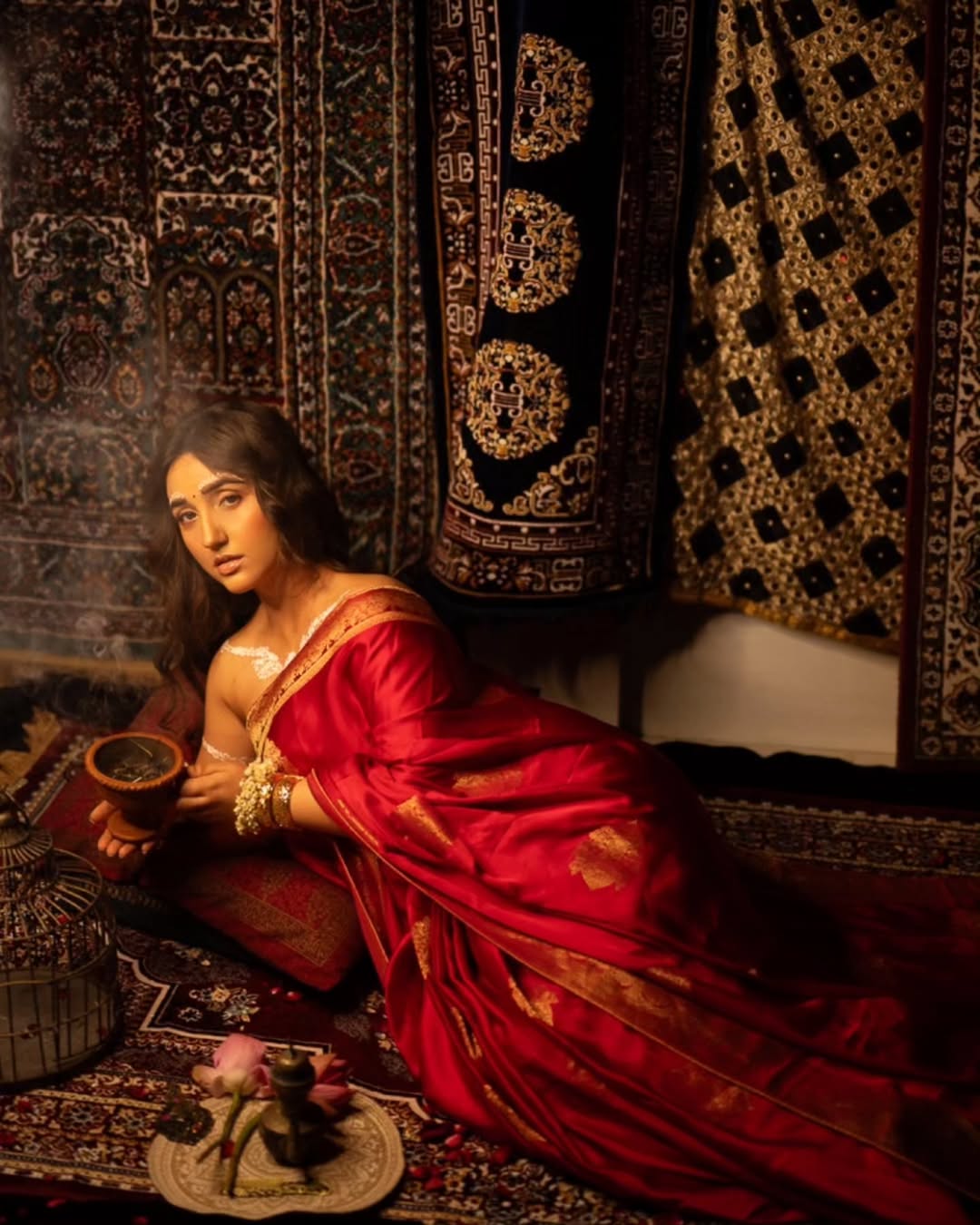 The bold Fierce Red reflects strength, confidence, and timeless elegance, making this saree stand apart as more than just attire—it becomes an expression. The satin base lends a natural sheen and fluid fall, while the Rangkaath technique ensures no two sarees are ever alike, making this a one-of-its-kind masterpiece.