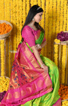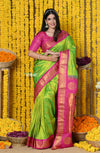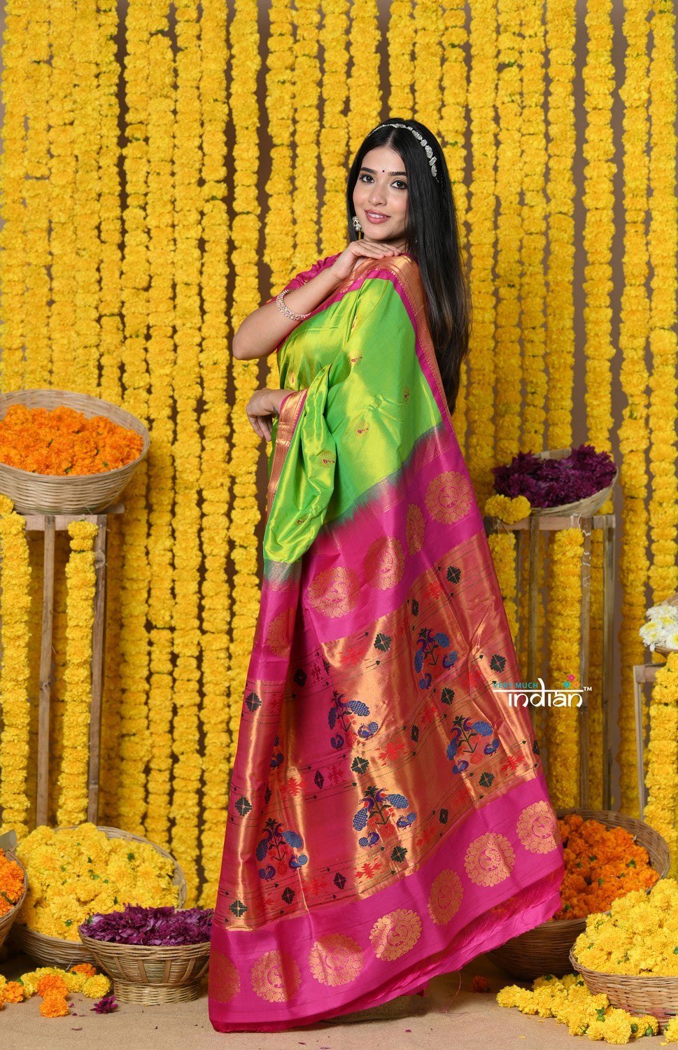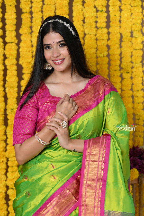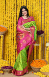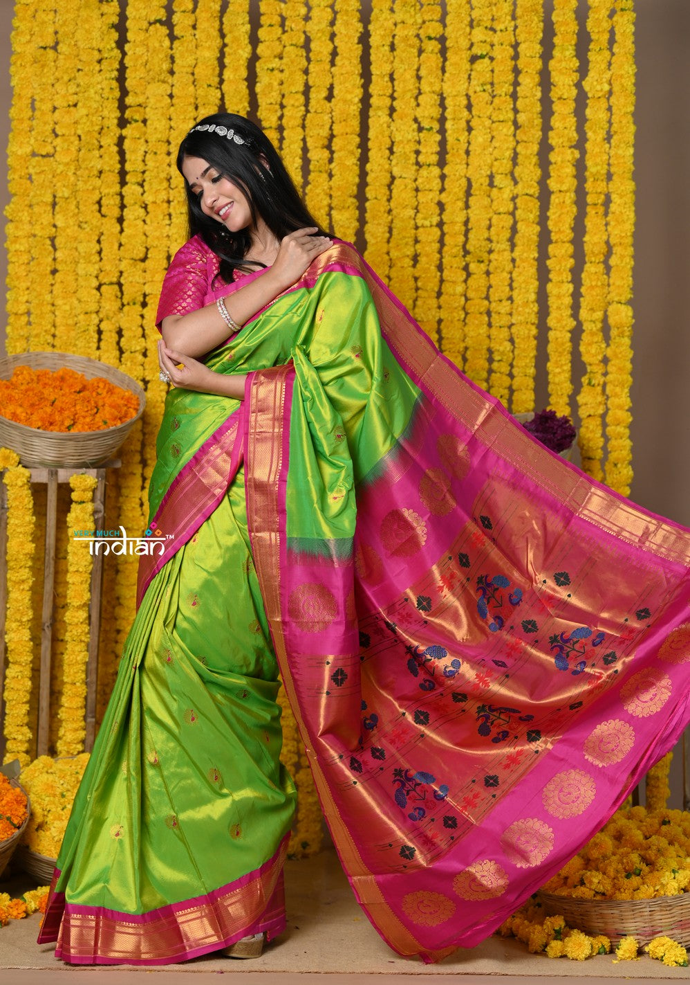 Regal! Royal! Relishing! This saree is thoughtfully designed with intricate work of zari which takes a laborious weaving of more than a month's time. The beauty of this saree gets enhanced by the grand parrot pallu reviving the luxurious weave enjoyed by the Royals of India.With Weaving of more than 200 hours, this Grand Maharani pallu has adequate reflection of royal design and art. This is a VMI prestige design and one of the latest accomplishments of our weavers. Pair this saree with your heavy jhumkas and gajra on the bun to bring that royal statement of ethnic and style.