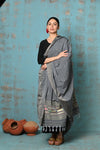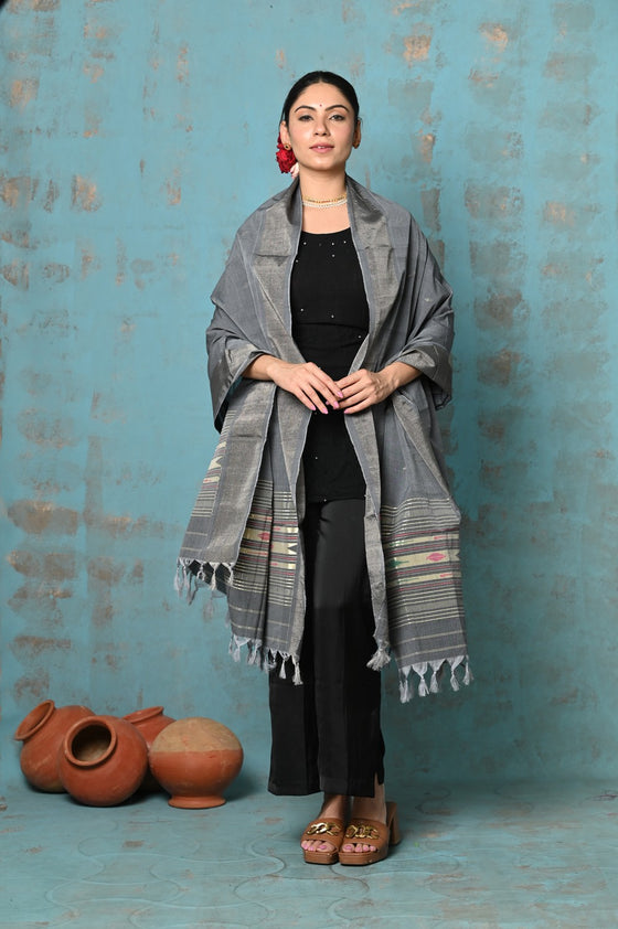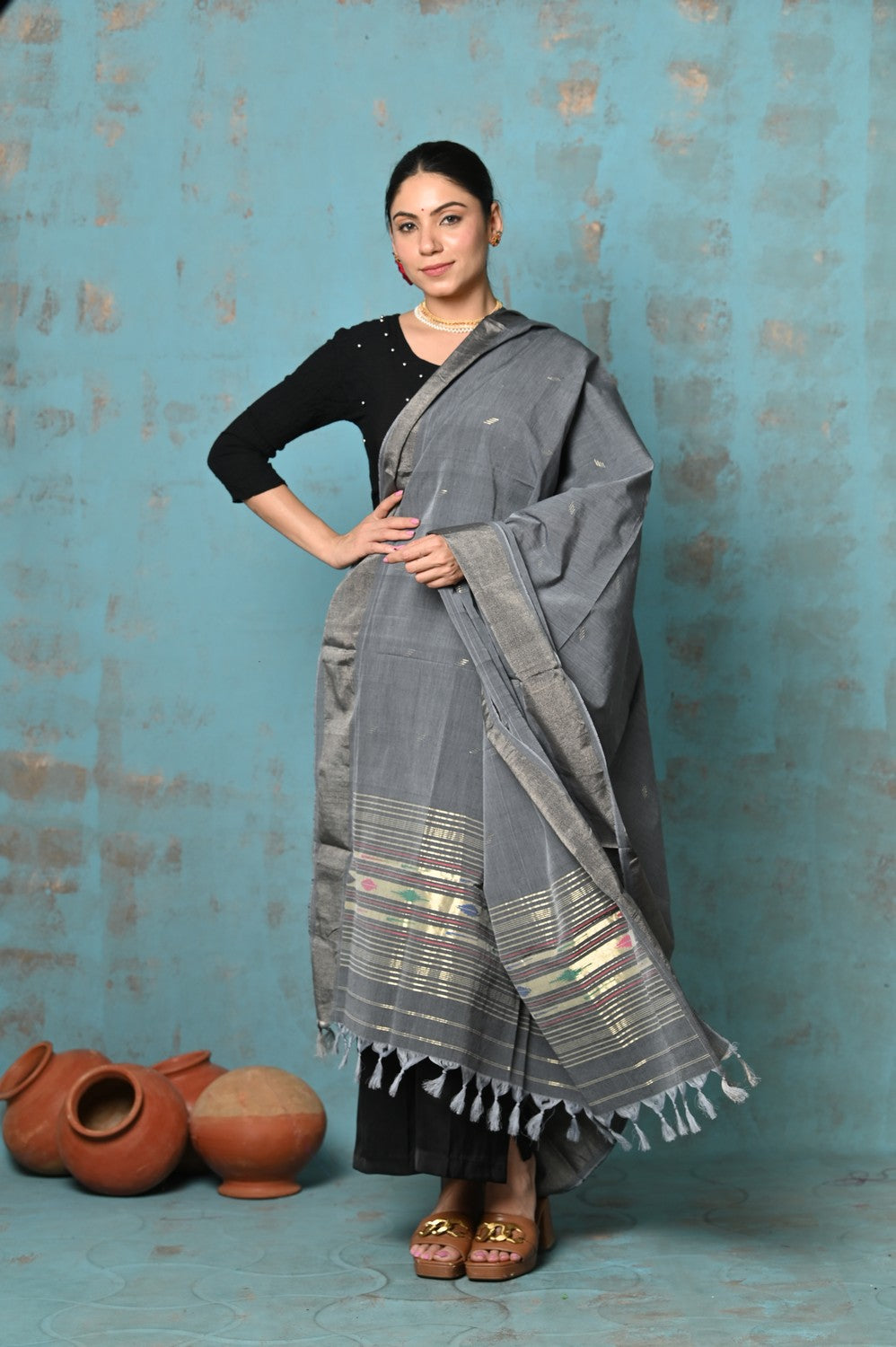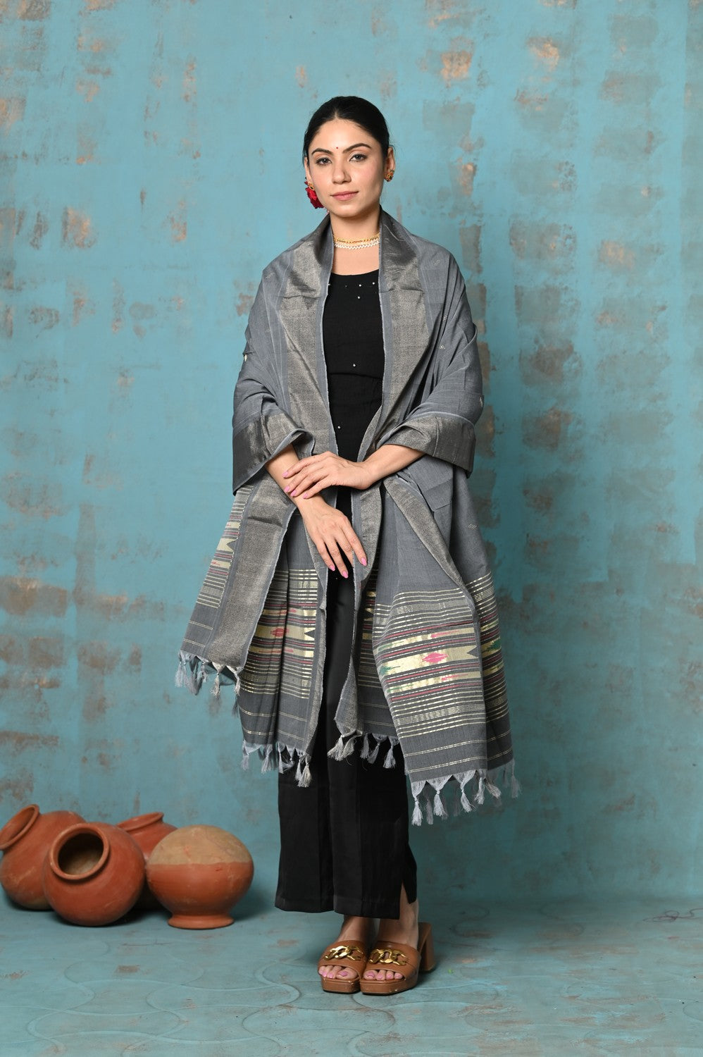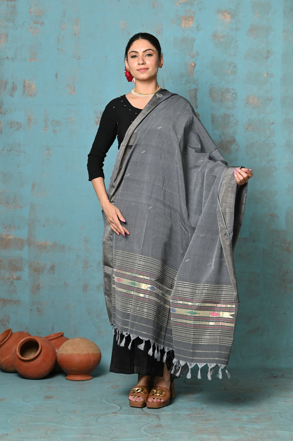 Tyohaar ~ Handloom Pure Cotton Paithani Dupatta With Beautiful Handweave and Tassels ~ Grey