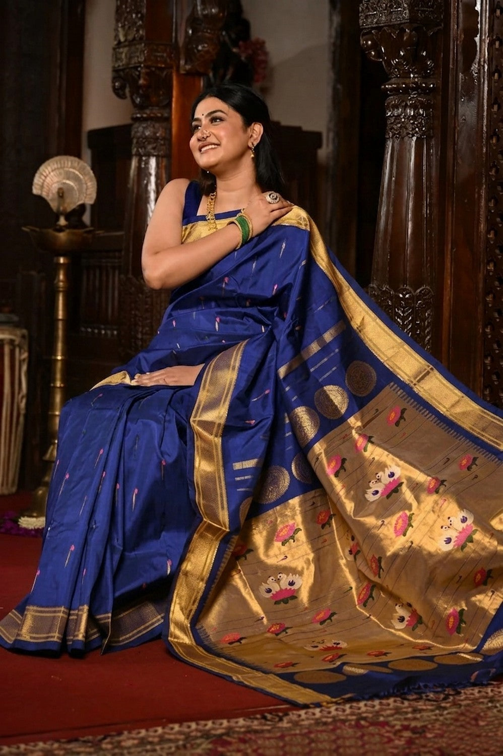 Elegant and captivating, this Handloom Pure Silk Maharani Paithani from the Virasat collection comes in a stunning Royal Blue , creating a beautiful play of color that shifts with every movement.