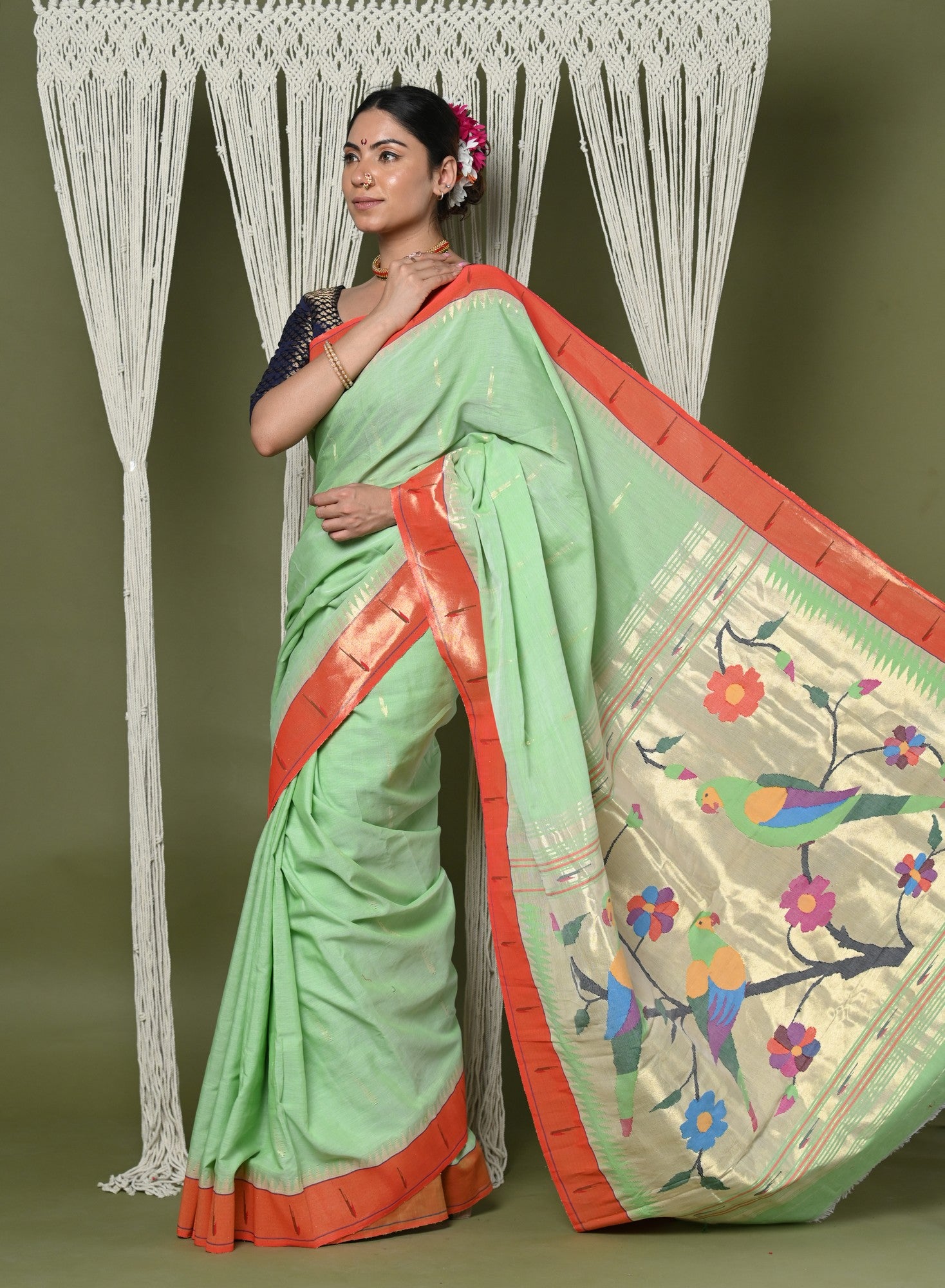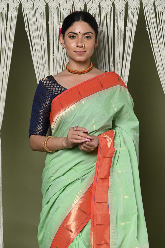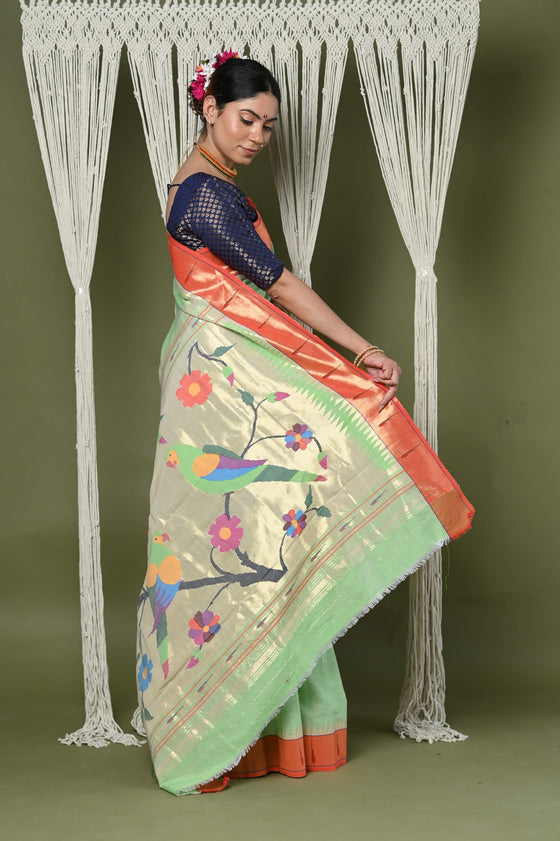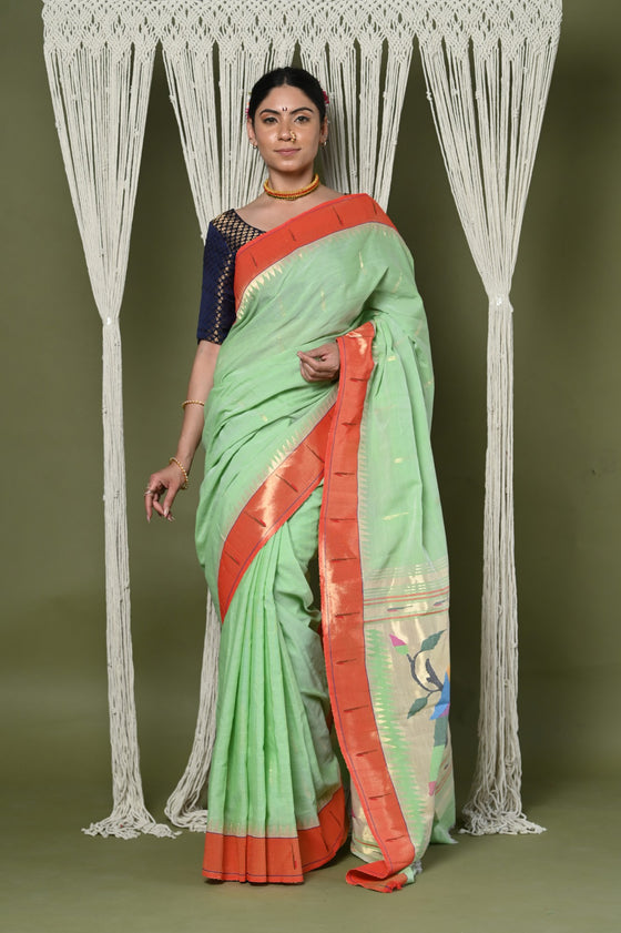 Handloom Pure Cotton Muniya Border Paithanis are classy and super stylish!! That gives you a break from regular sarees and makes you look elegant and royal, we would say a must have in your wardrobe and don't forget to share with us the compliments you get for this drape. Our Pure Cotton Paithani sarees come directly from the weavers of Maharashtra, yes we proudly support the local!!!. \r\n\r\nThis saree will make you feel like having royalty in your wardrobe.-100% Authentic Cotton fabric - Weave of more than 80 hours- Handcrafted by senior talented weavers.-Variety of colors and premium sareePair it with your favorite ornaments and make your own style statement!