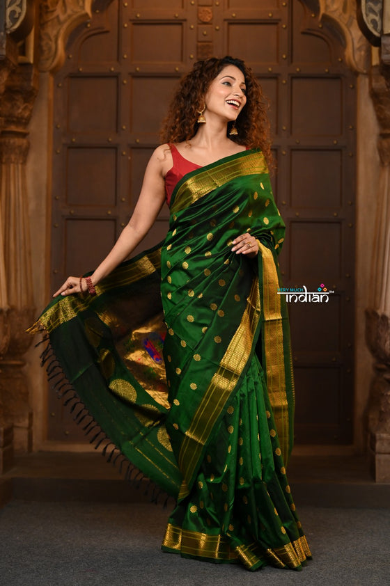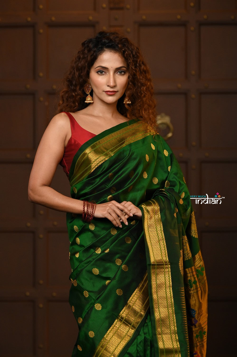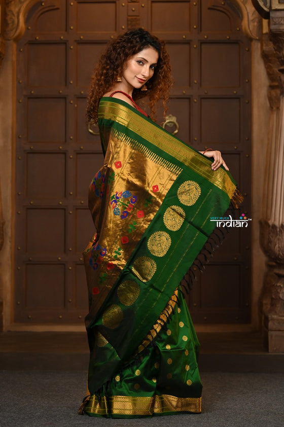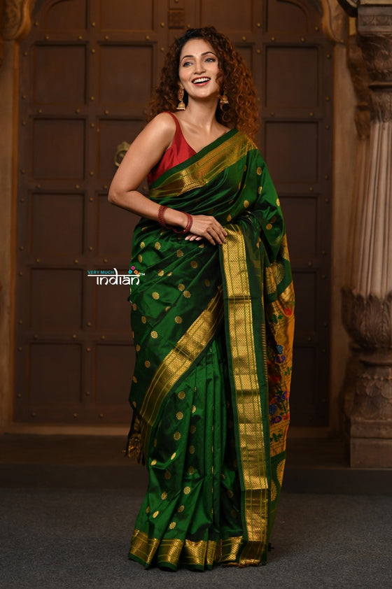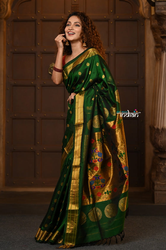Draping yourself in a saree so exquisite, it feels like poetry woven in silk— Maharani Paithani, where tradition meets pure royalty. This Maharani Paithani saree is more than just fabric; it’s a labor of love, handwoven over 100 hours by master artisans who have inherited the craft through generations. The rich, buttery silk glides over your skin, while the intricate zari work shimmers like liquid gold under the light. You witness a story unfold with every fold—vivid peacocks dancing on the pallu, delicate craftmanship blooming across the borders, and age-old chakra motifs whispering tales of Royalty. This isn’t just a saree; it’s an experience—one that commands admiration, exudes power, and wraps you in an aura of timeless elegance. Whether for a wedding, a grand celebration, or a moment where you simply want to feel like royalty, Maharani Paithani is the ultimate indulgence. Because some traditions aren’t meant to be worn; they’re meant to be lived. Specifications Saree Color: GreenFabric: Pure Silk Wash Care: Dry Clean Weave type: Paithani Pattern: Solid Brand: Very Much Indian Occasion: Party Wear/Traditional Drape Product category: Paithani Length: 6.25 Metres (including blouse) Notes The blouse worn by the model in the image is from our wardrobe. You can find the running blouse around the length of the saree or you can simply get that ideal look by draping up the saree with a contrast blouse. Since the sarees are hand-dyed, please expect a slight variation from the product displayed in the picture. These minor irregularities are a characteristic feature of genuine handmade products.