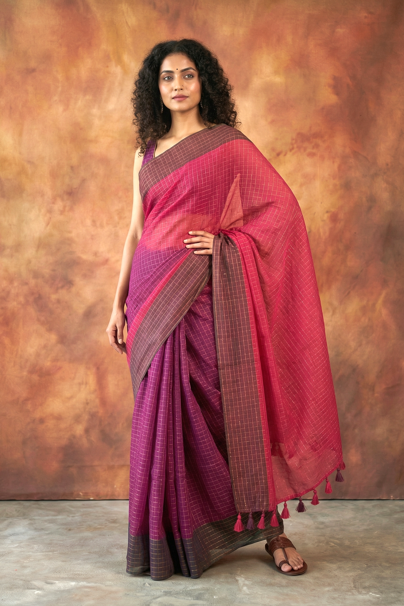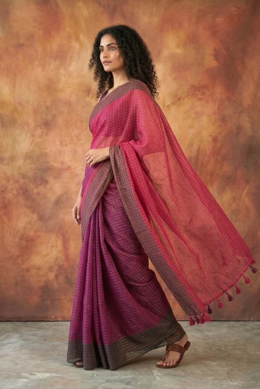 Embrace effortless grace with this stunning Magenta Mul Saree. Designed for the modern woman who values comfort without compromising on style, this saree features a sophisticated dual-tone plum and magenta base. The fabric is woven with a fine golden check pattern that catches the light beautifully, adding a touch of shimmer to your every movement.