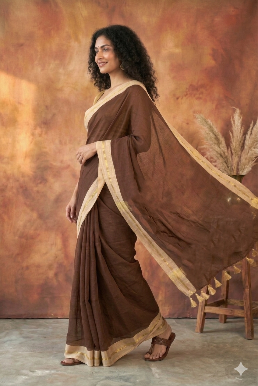 Embrace the perfect blend of comfort and sophistication with our Cocoa Brown Mulmul Cotton Saree. Crafted from premium, breathable mulmul fabric, this saree is designed for the modern woman who values heritage with a minimalist touch. The rich, earthy brown hue is beautifully offset by a contrasting cream border featuring delicate gold zari pinstripes, making it a versatile choice for both office wear and festive gatherings.