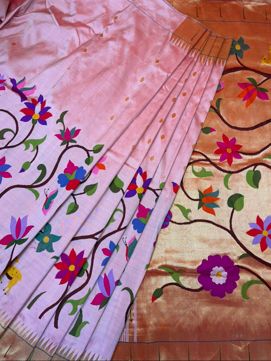 Ready to ship immediately!This is a Prestige Saree of VMI, High Quality Pure Silk Muniya Border Paithani. Half Fallover Paithani, this saree is handcrafted with fine pure silk all over the saree. The efforts of our weavers to bring this saree can be noted with the fact that it takes more than 700 hours of weaving.Indeed 3 months to manifest this gorgeous design in 6 yard lay. Luxurious embrace of the floral pallu reflects the eternal talent of our weavers and art of Paithani saree. The beautiful white color of this saree softly nourishes the eye of any weaver as it adds the delight to the whole Paithani art.